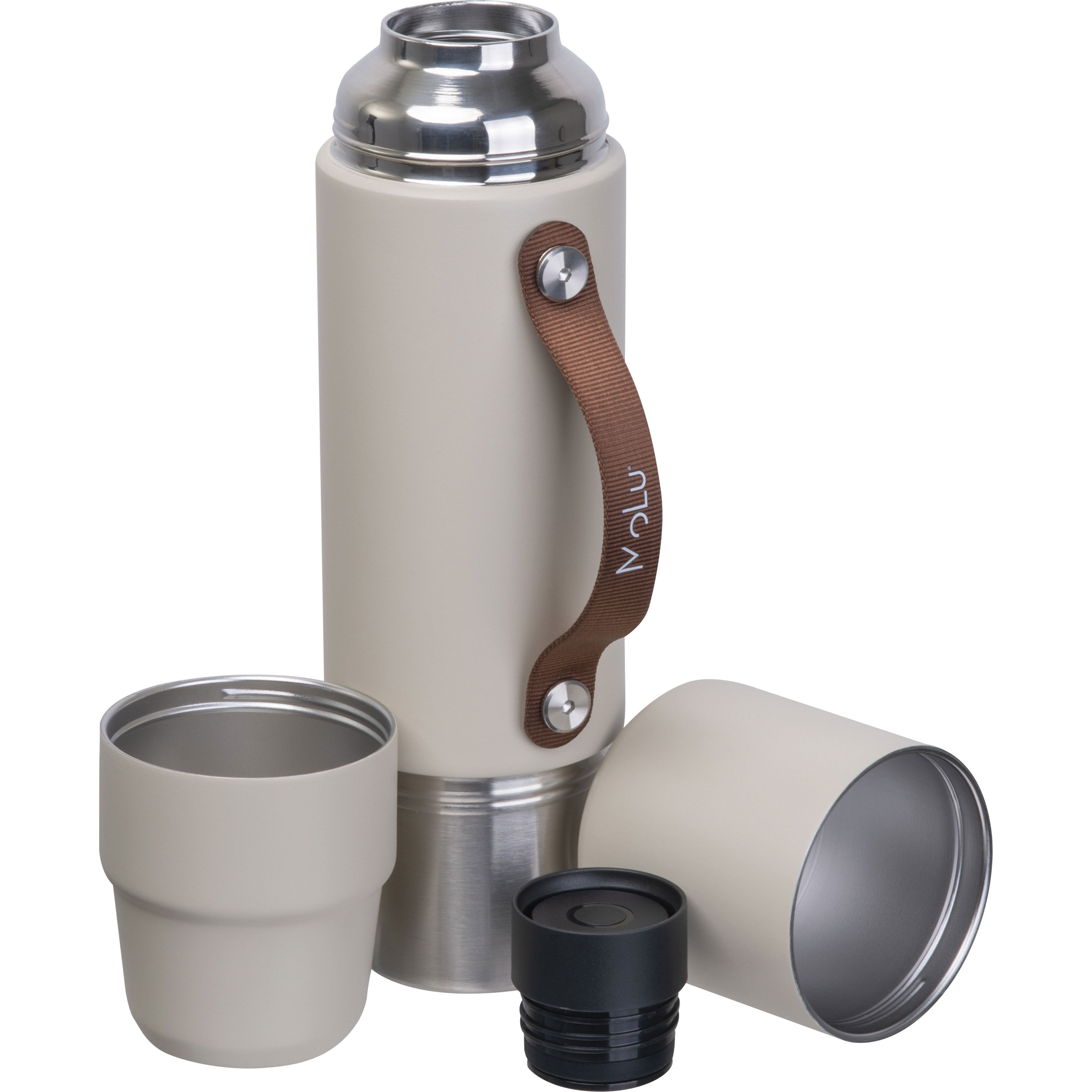 Made from recycled stainless steel, double-walled and copper-insulated – keeps drinks hot or cold for up to 20 hours. Integrated into the design: two cups – one in the lid, one at the base. Featuring a refined brown handle – ideal for drinking, pouring, or carrying. Thoughtfully designed, durable, and perfect for on the go – MoLu at its smartest.